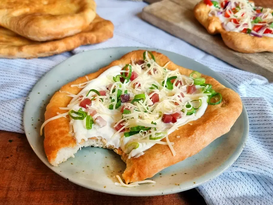 V tejto verzii máte úplnú kontrolu nad chuťou aj nad tým, čo na langoš položíte. Môžete zostať verní klasike so smotanovým krémom, syrom a slaninkou, alebo skúsiť ľahšiu zeleninovú kombináciu s paprikou a cibuľou.