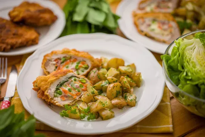 Hľadáte recept, ktorý spája šťavnaté bravčové mäso, lahodnú plnku zo zeleniny a syra a jemnú, voňavú prílohu? Tento plnený bravčový rezeň je ideálny – mäso je plnené kombináciou údeného mäsa, zeleniny a dvoch druhov syra, obalené do chrumkava a podávané s voňavými petržlenovými novými zemiakmi. Perfektný na víkendový obed alebo sviatočný stôl.