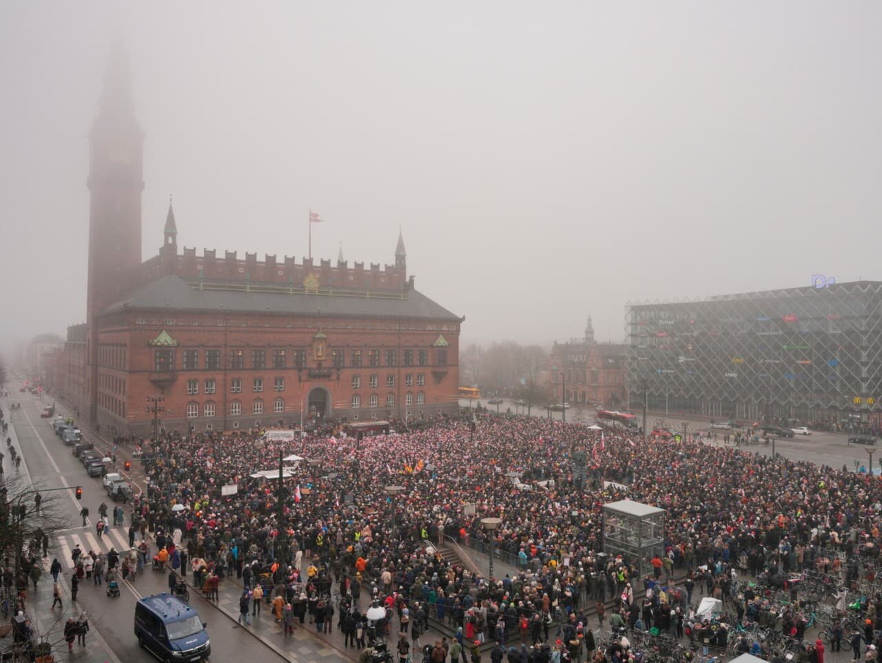 Demonštranti mávali dánskymi a grónskymi vlajkami pred radnicou a skandovali „Kalaallit Nunaat!“ – grónsky názov ostrova. Masová účasť bola ohlásená aj v ďalších dánskych mestách, ako sú Aarhus, Aalborg či Odense, a sesterská demonštrácia sa konala aj v grónskom hlavnom meste Nuuk.