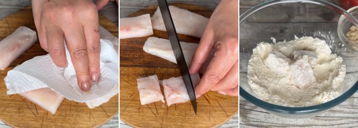 Filety osušte papierovou utierkou, nakrájajte na menšie kúsky a obaľte v hladkej múke.